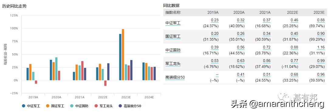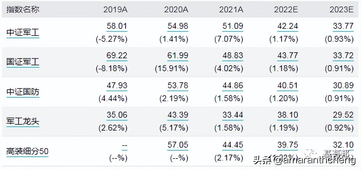 从2022预测EPS看,最高的是中证国防0.88,最低的是国证军工0.45,从增速看,最高的是高装细分50,增速33.25%,最低的是军工龙头,增速-11.04%,详见下图: