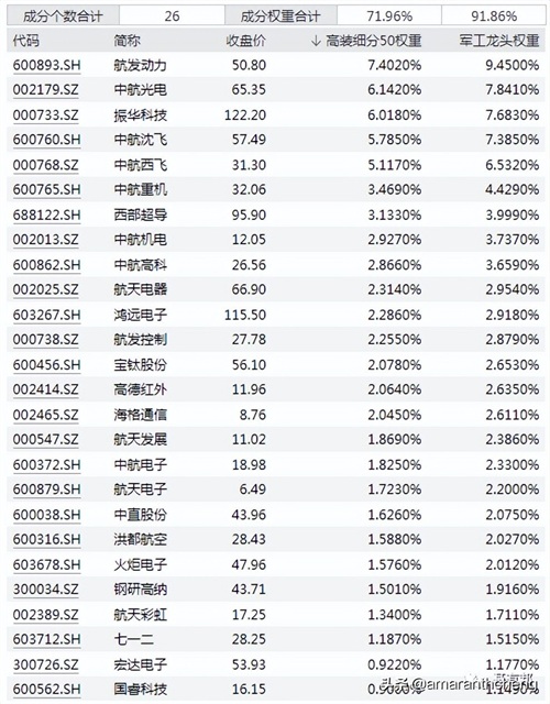 5、高装细分50和军工龙头共有的成分股数量为26只,占高装细分50权重71.96%,占军工龙头权重91.86%,详见下表。