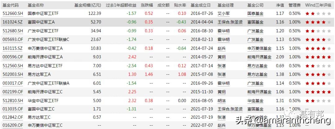 4、跟踪国证军工指数基金数量为2只,规模为9.84亿元,详见下表:
