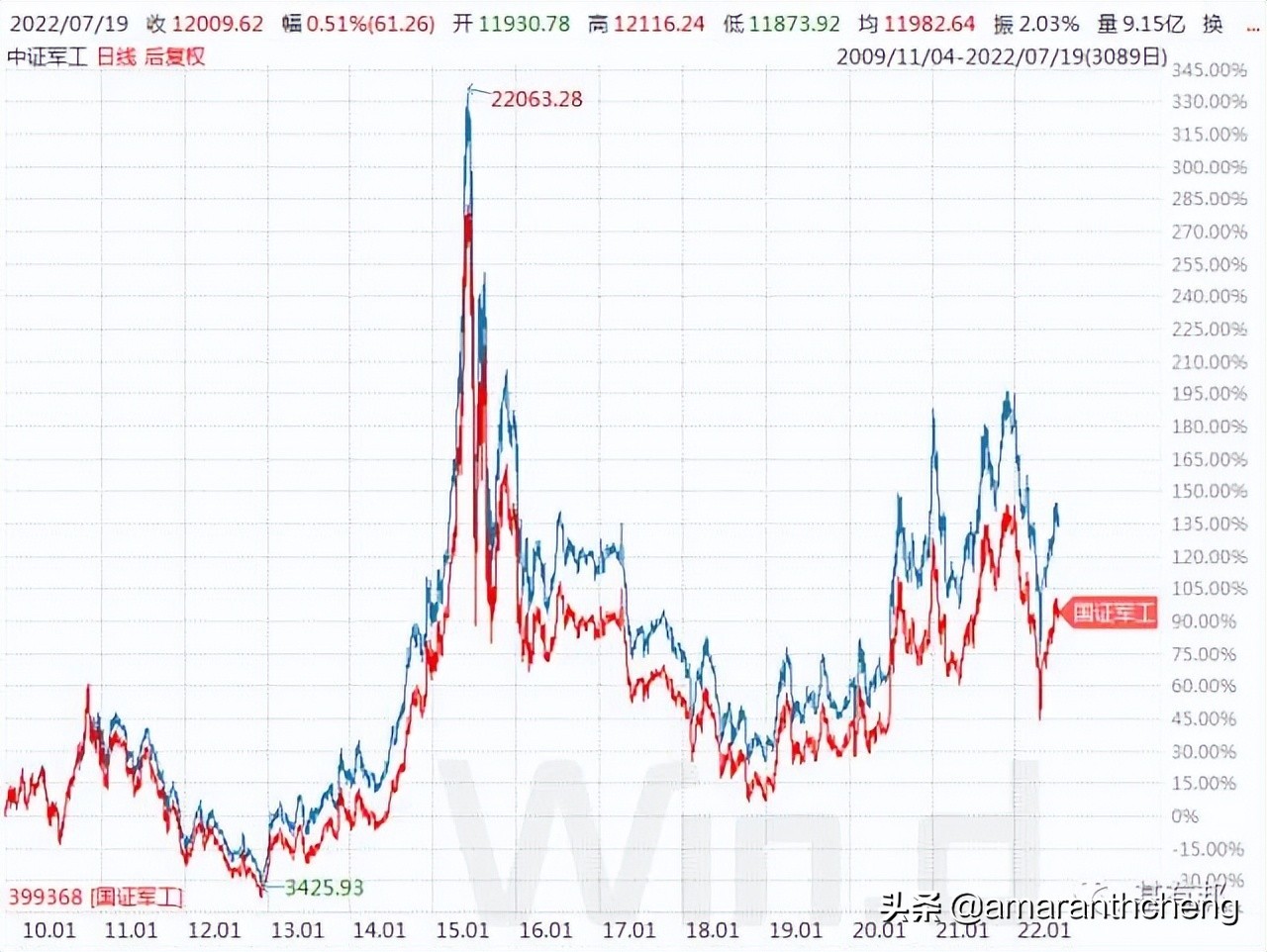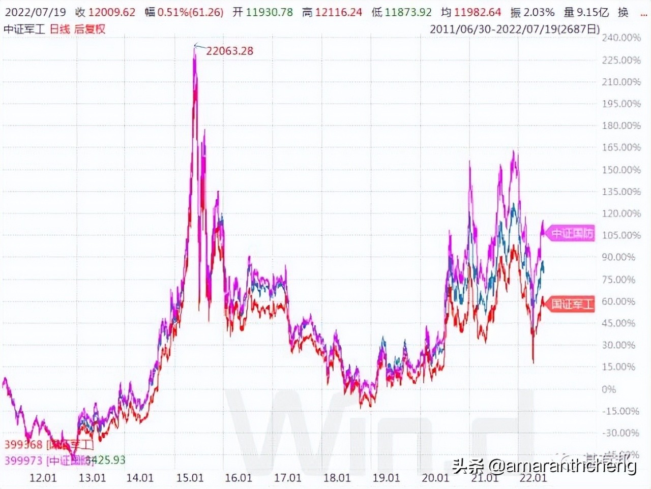 2、自11-06-30中证国防基日起至22-07-19,中证国防指数夏普比率0.31较中证军工0.27和国证军工0.23指数高。