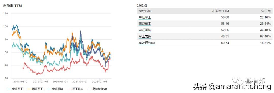 从2022预测PE看,最高的是国证军工43.77,最低的是军工龙头38.1,详见下图: