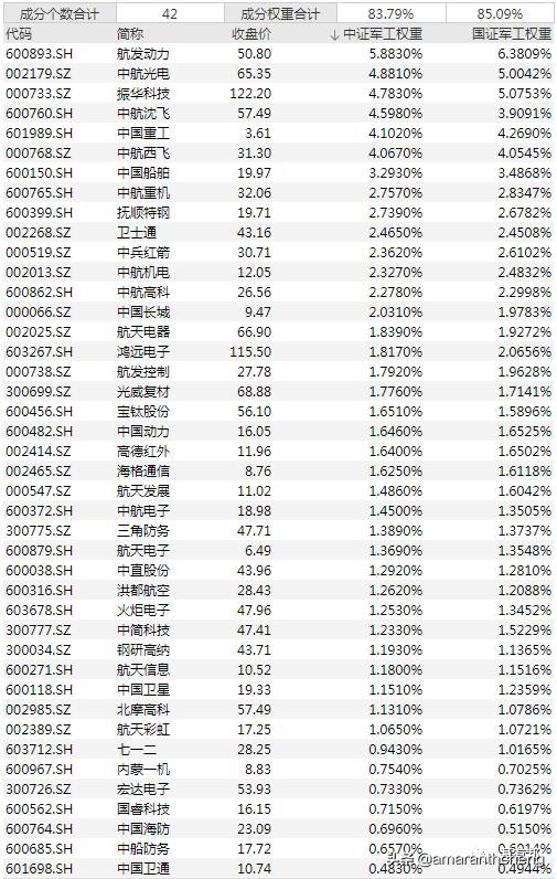 1、中证军工和国证军工共有的成分股共42只,占中证军工权重83.79%,占国证军工权重85.09%,详见下表: