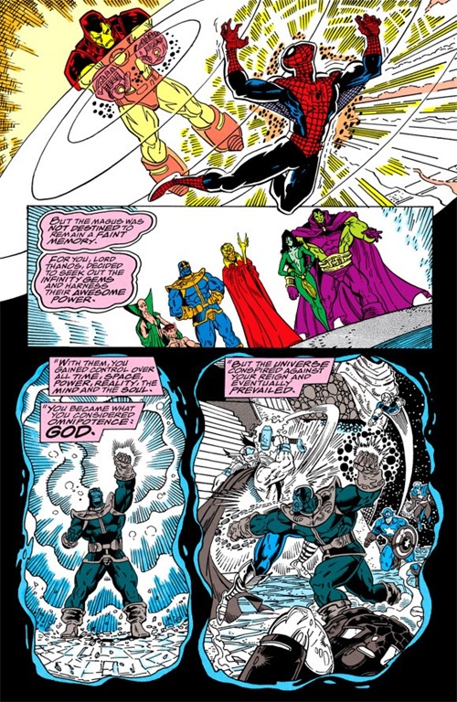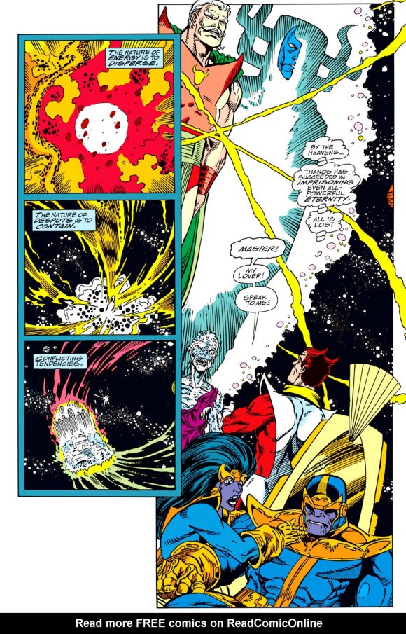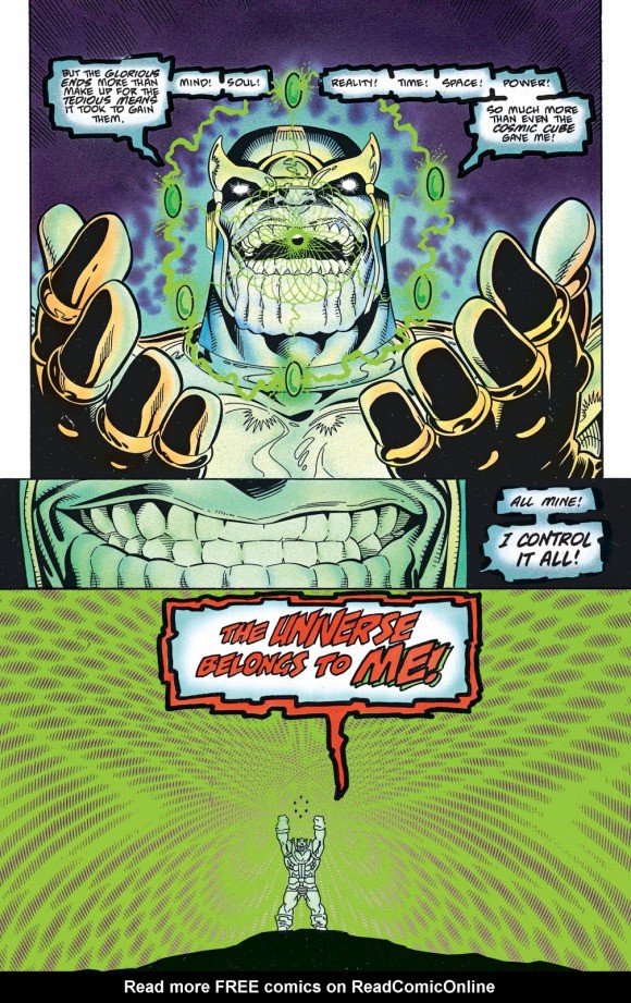 当灭霸获得无限宝石的力量之后,他足以向整个现实一切事物的化身-永恒发起挑战,并战胜永恒取代其在现实中至高无上的地位。