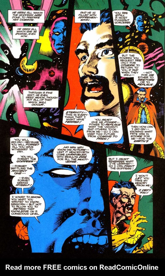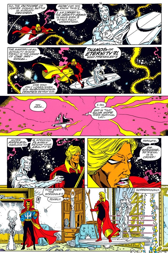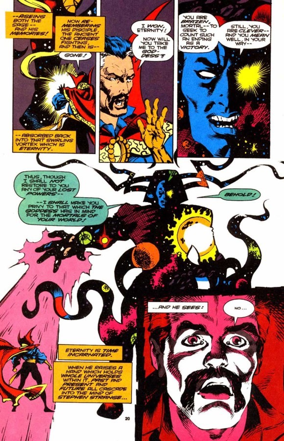 而出自奇异博士:至尊法师第54话,我们可以很明确地看出,这个被无限宝石所超越的永恒,尽管只是单个现实的永恒(单体永恒),但依然能够把整个多元宇宙握在手中(when he rises a hand which holds whole universes within it)