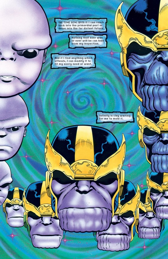 通过时间宝石,灭霸能随意回到万物起源之时并肆意探究未来之事。时间对于灭霸再也没有意义。如果灭霸发现何物不如他心里所愿,他能轻而易举地修改万物,让一切都和他的心意一般无二.