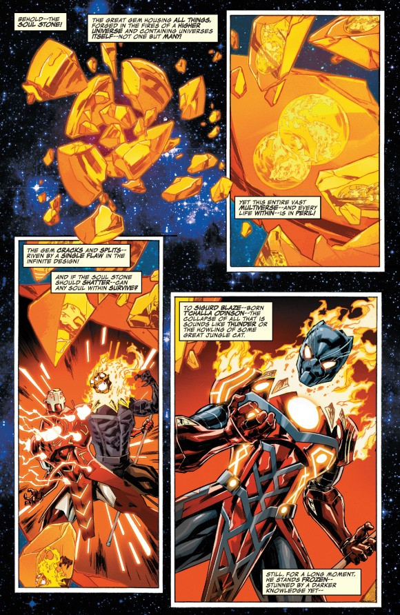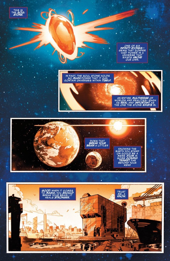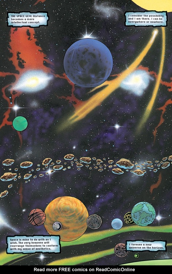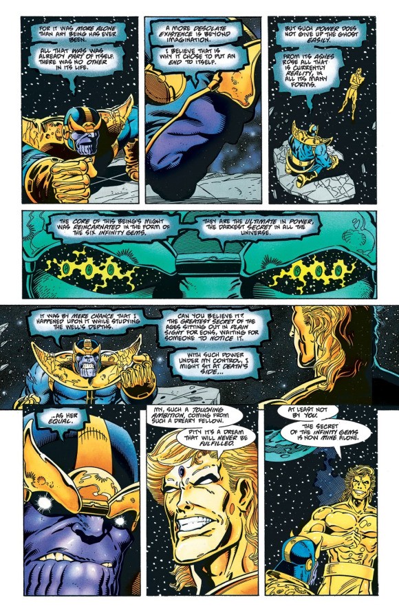 从无限宝石的前身无限存在(infinite being)身上燃起了整个多元宇宙的一切现实,同时明确无限宝石是整个宇宙的终极力量,代表了最黑暗的秘密。