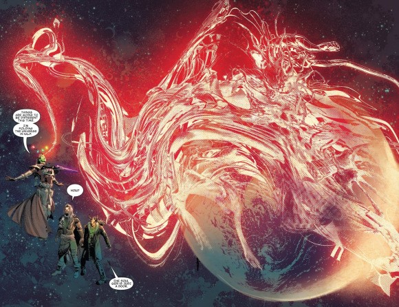 出自术士亚当与无限守望者第4话,灭霸以地球为中心用无限宝石打出了一道神波,这道神波从地球出发,横扫整个星系,宇宙,整个多元宇宙内的无限现实,最终甚至影响到了超越神族的领域-整个全能宇宙的虚空。
