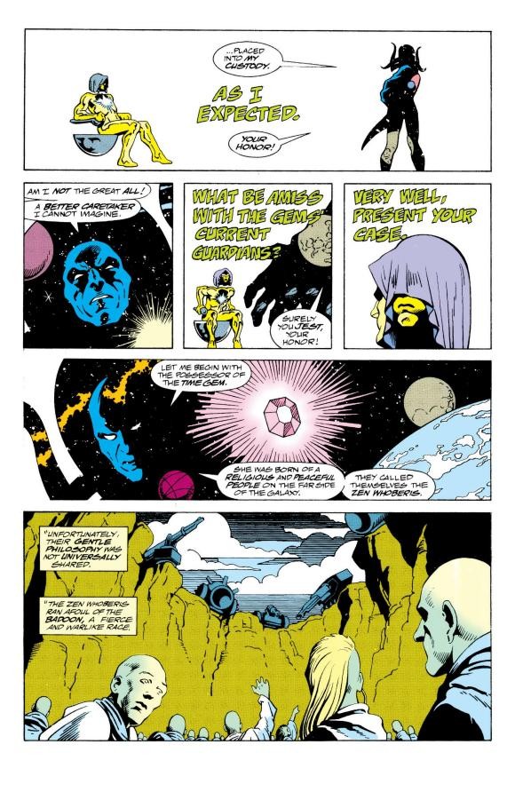 出自术士亚当与无限守望刊,永恒向法庭抱怨,本身自己是现实内一切事物的绝对主宰,但是自从无限宝石被发现之后,拥有无限宝石的人就脱离了自己的控制,并拥有能挑战自己的能力。