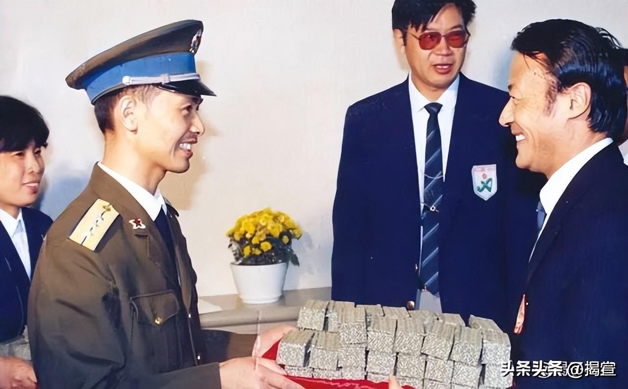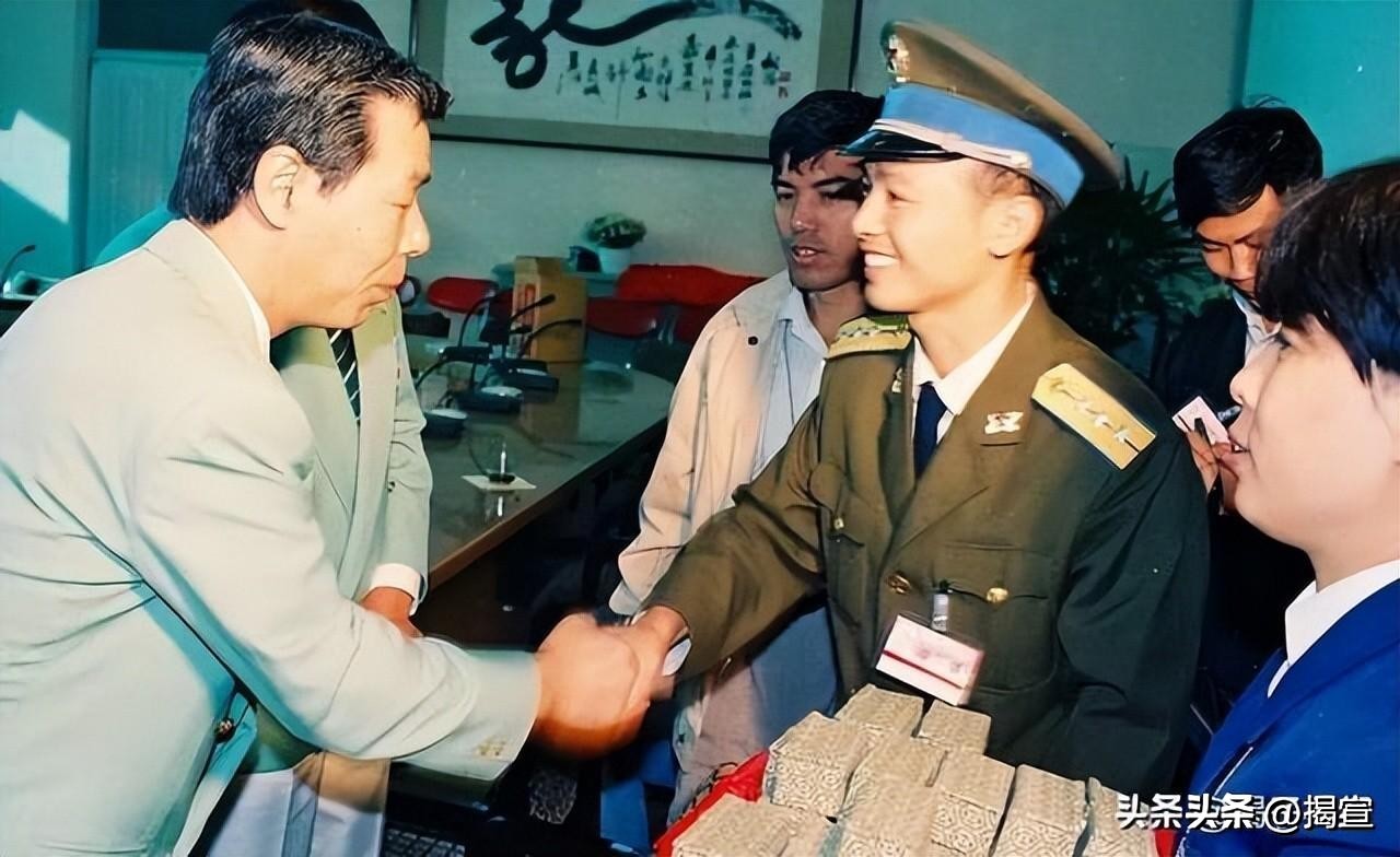 1990年10月8日,在北京第十一届亚洲运动会闭幕后的第二天,揭晓上尉(左)到北京亚运村向韩国体育代表团团长(右)赠送韩国冠军印章