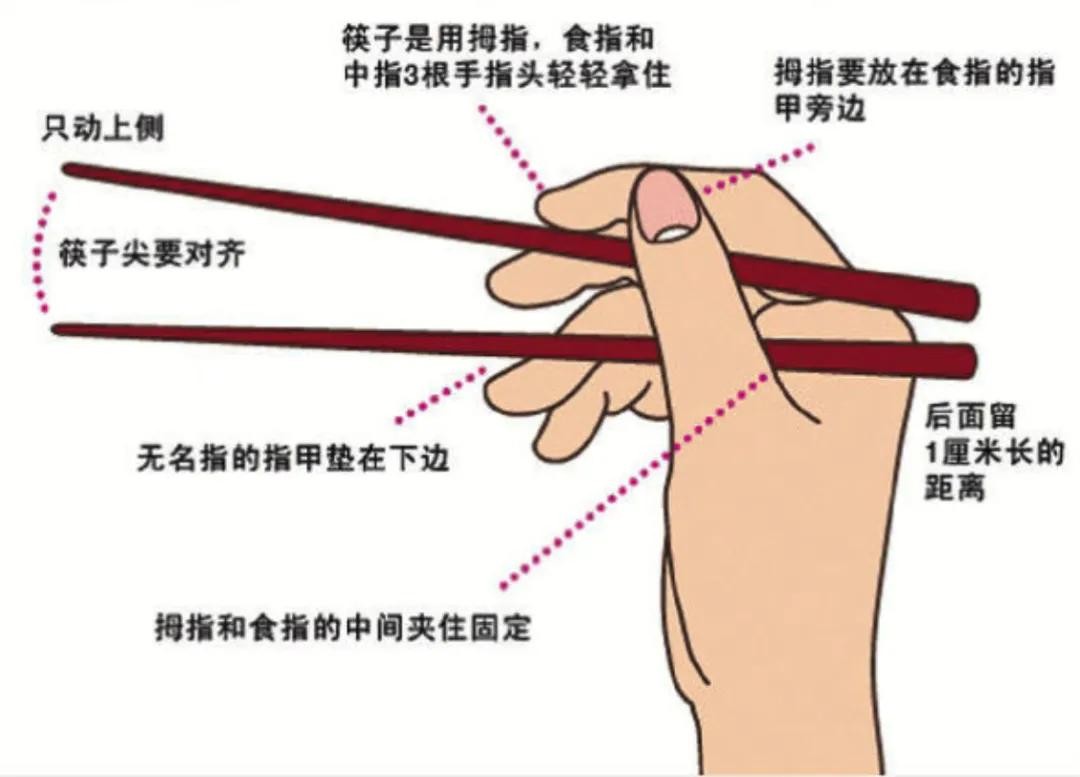 在日常生活当中,对筷子的运用是非常讲究的。正确的使用方法讲究得是用右手执筷,大拇指和食指捏住筷子的上端,另外三个手指自然弯曲扶住筷子,并且筷子的两端一定要对。