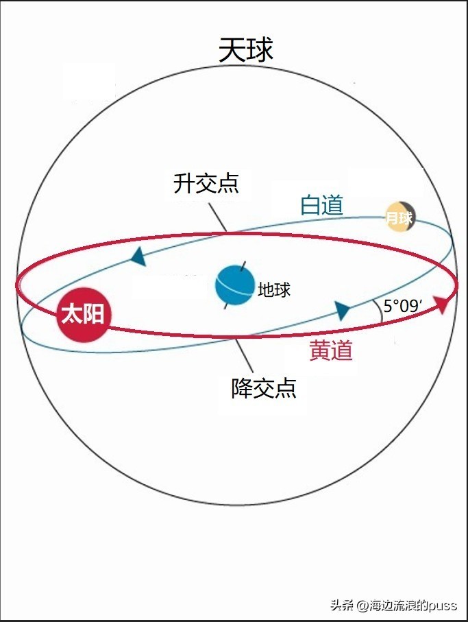 如果从侧面看,月球和地球的运行轨道不在同一平面上!也就是说白道和黄道不重合,它们之间有个5°09′的夹角。如果你真要让“日月地”连成一条直线,那就可能观察到日食或月食了。