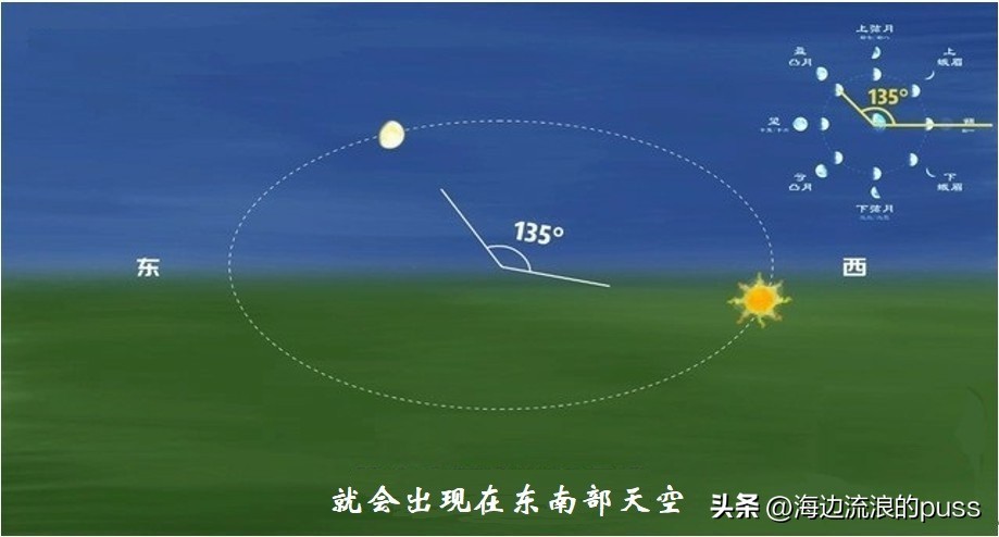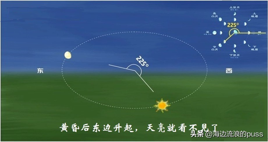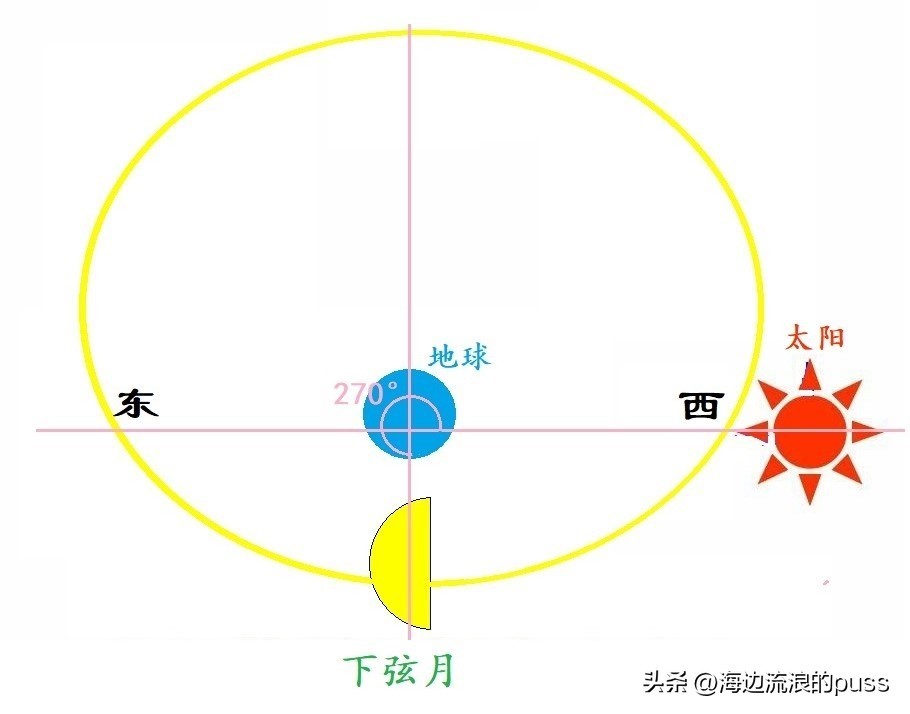 所以我们只能在下半月的下半夜看到下弦月,被太阳照亮的月面朝东,出现在东边天空,所以人们总结的口诀为“下下下东东”。