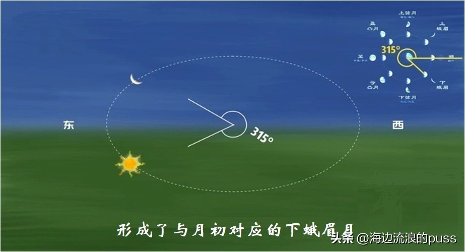 新月过后,大约一两天,日月黄经差慢慢变大,月球自西向东绕地球公转,此时月球跑到太阳的东边去了,月球被太阳照亮的半个月面朝西,与太阳同时升起同时落下,所以白天看不到月亮,只有在日落之后的一段时间,我们才能在西边的低空看到一轮弯弯的蛾眉月。
