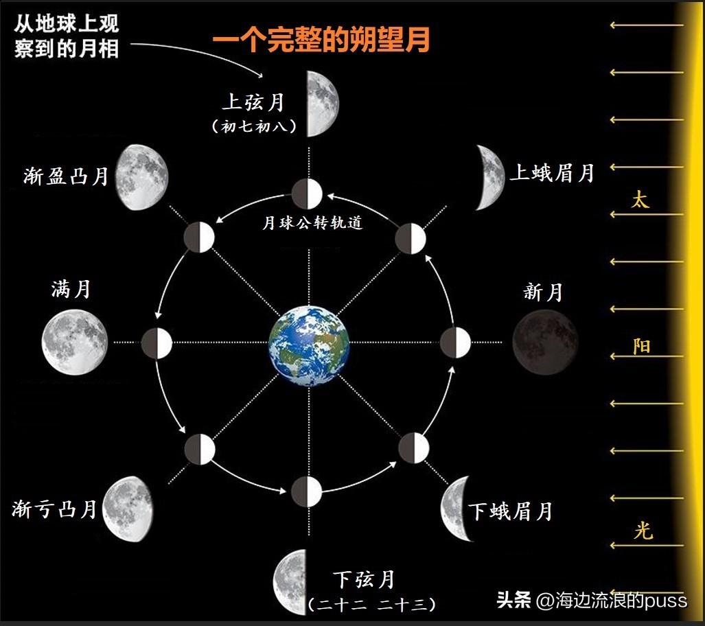 可见,月相的变化依次为:新月或朔(初一)→上蛾眉月→上弦月(初七、初八)→凸月(渐盈凸月)→满月或望(十五,十六)→凸月(渐亏凸月)→下弦月(二十二、二十三)→下蛾眉月→新月(初一)。月球绕地球公转一周,月相由朔到下一次朔所经历的时间间隔,即月相变化的周期,叫做朔望月。