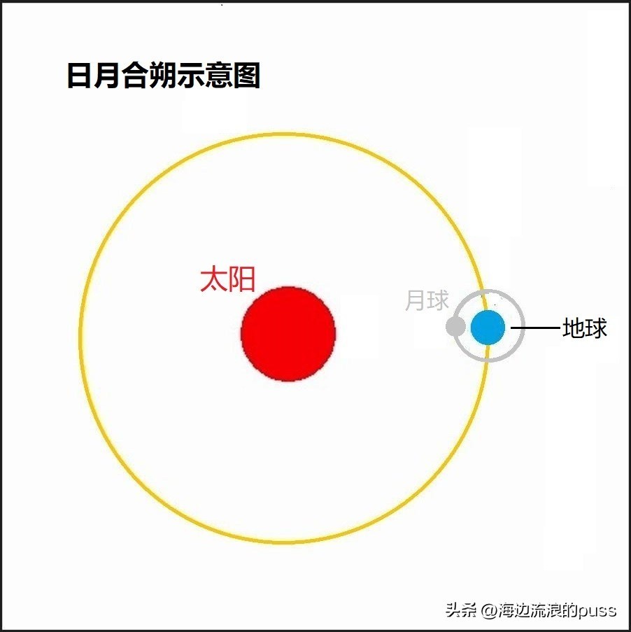 所以“朔”,准确说是日月“合朔”,就是月球和太阳在黄道上的经度相同,即处于同一方位,二者同时出没的时刻,这时的月亮叫“新月”,实际上是完全看不到月亮的“月黑天”。有人说就是太阳月球和地球在一条直线上的时候,这是不对的,下面这张图是从北往南,从上往下看的俯视图,所以不要被误导了(为了便于理解,本文所有图片的方位都是:左东右西上南下北)。