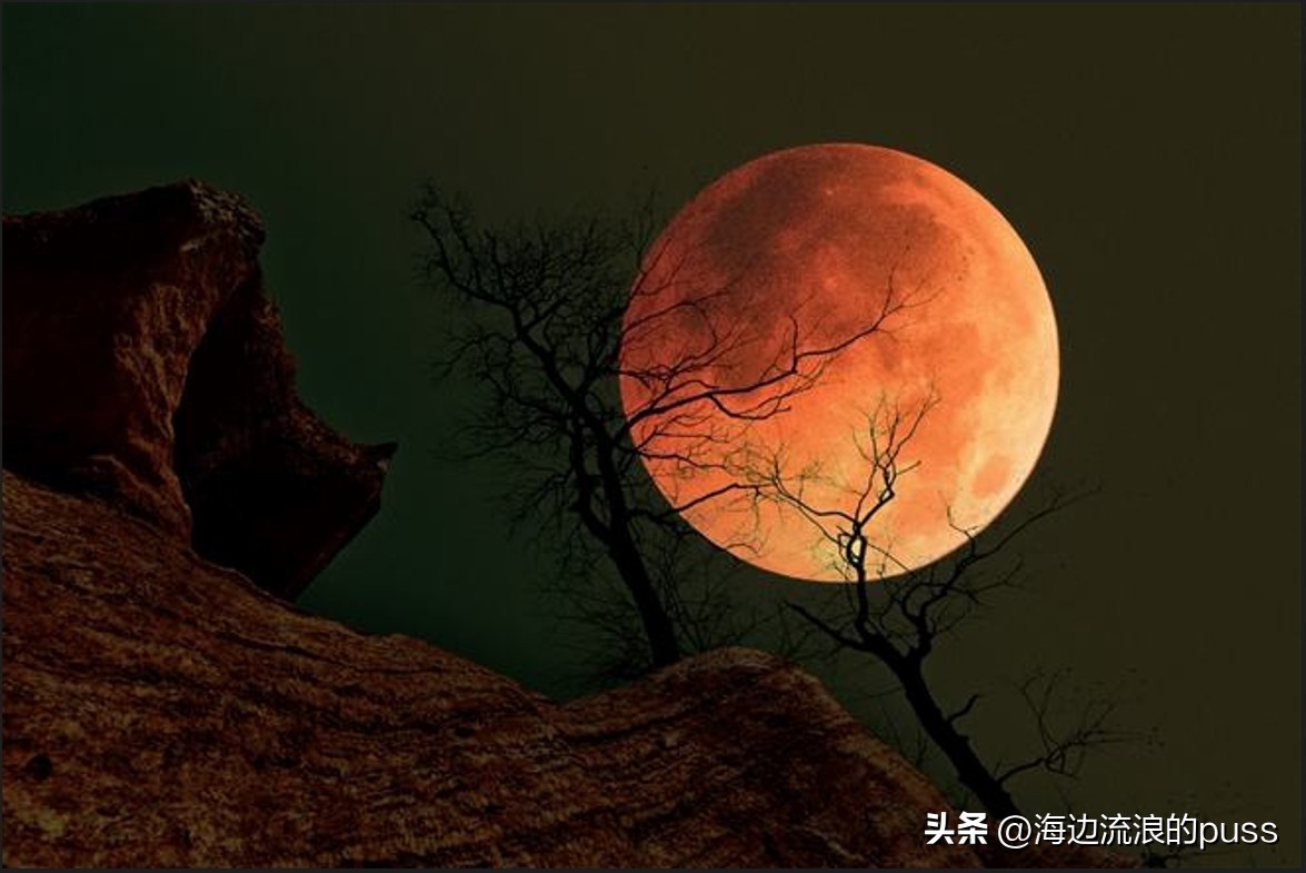 古人认为血月出现是大凶之兆,这完全是迷信思想作祟。其实,只要月亮出现在地平线附近,厚厚的大气层将其他颜色的光吸收掉,就会把红色光折射到月球表面上,所以月出月落就和日出日落一样,都会呈现血红色。