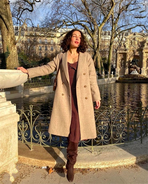 内搭一件黑色波点连衣裙和酒红色长靴,在明暗交替的色彩中建立起复古的浪漫,隐藏在低调冷静色彩下的,是优雅耐看的法式魅力。