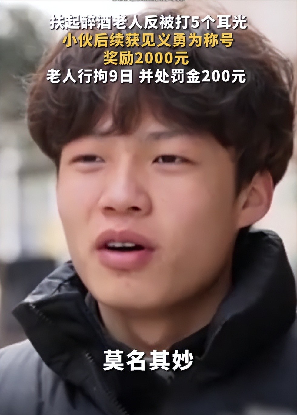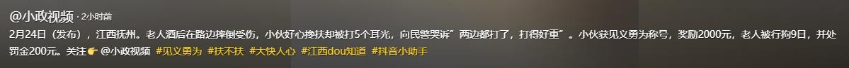 小政视频·2025年2月24日(发布),江西抚州。老人酒后在路边摔倒受伤,小伙好心搀扶却被打5个耳光,向民警哭诉”两边都打了,打得好重”。小伙获见义勇为称号,奖励2000元,老人被行拘9日,并处罚金200元。