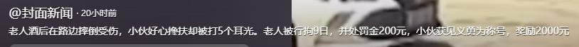 信息来源:封面新闻.2025年2月23日 老人酒后在路边摔倒受伤,小伙好心搀扶却被打5个耳光。老人被行拘9日,并处罚金200元,小伙获见义勇为称号,奖励2000元