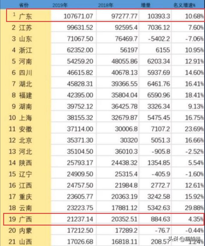2019年,广东初核GDP107671亿元,全国第一。广西GDP21237亿元,全国第19,广东为广西的5.07倍。