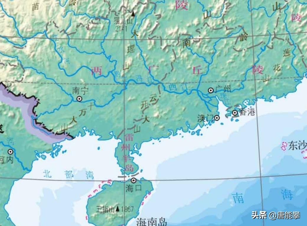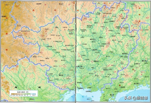 从地形图来看,广东与广西的地形相似。广西是从第二级台阶云贵高原向北部湾开始,从山区、深丘、浅丘逐渐下降海拔,过渡到沿海平原,广东则是从南陵逐渐下降到珠江三角洲平原。