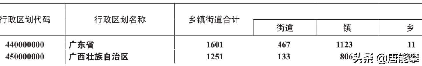 从乡镇区划来看,2018年,广东1601个乡镇街,街道有467个;广西1251个乡镇街,街道只有133个。街道办的城市化程度高于镇,镇高于乡,广东全省只有11个乡,而广西还有1251-133-806=312个。