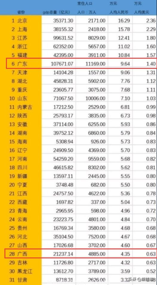 从常住人口平均来看,广东人均9.64万元,广西4.35万元,广东是广西的约2.22倍。