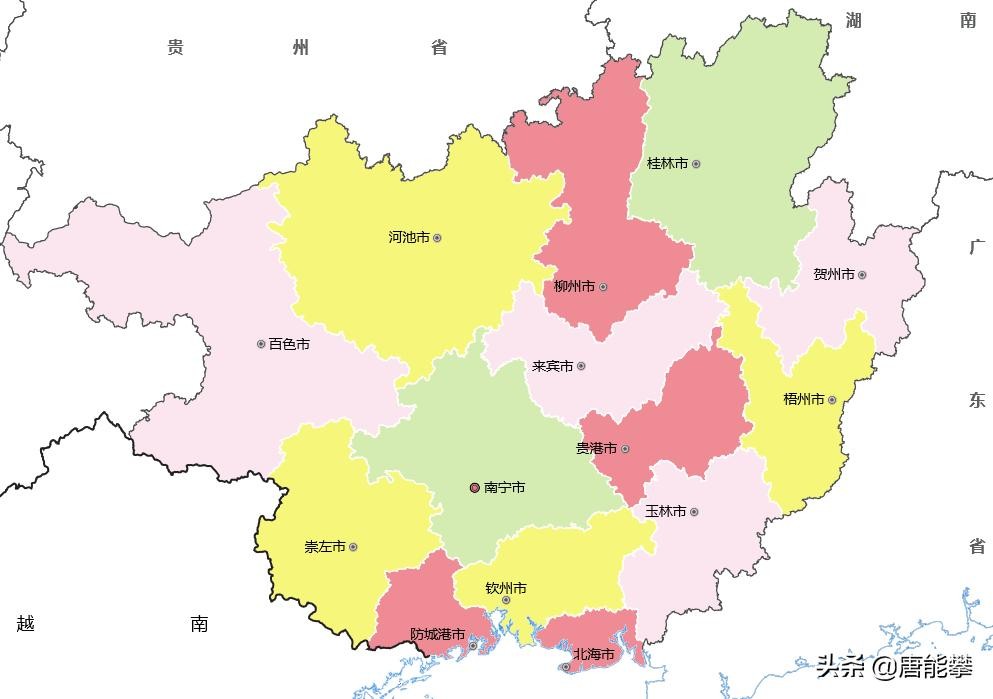 广西壮族自治区,有14个地级市,正好是广东的2/3。在笔者的印象中,北部湾的防城港、钦州市、北海市以及曾经做过省级中心南宁市、柳州市、桂林市比较发达,其他城市中靠近越南的崇左和百色,靠近广东的玉林、梧州、贺州也比较知名,剩余3市河池、贵港、来宾则十分低调。