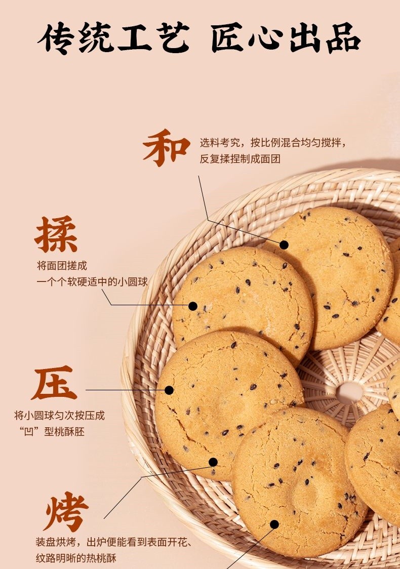 独立包装,方便携带:每块桃酥饼干都采用独立包装,干净卫生,方便携带,随时随地都能享受美味,是居家旅行、办公休闲的必备佳品。