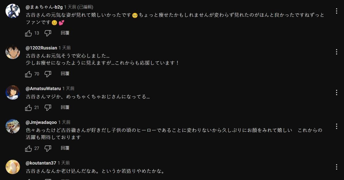 从网友的留言中可以看出,大家对于他过去的丑闻并未过多提及,更多的是对他外貌变化的惊讶。毕竟许久没有他的消息,这次露面虽说消瘦了许多,但好在看起来健康有活力,毕竟古谷彻已经是71岁的长辈了。