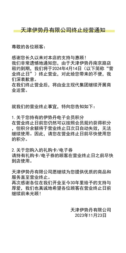 天津伊势丹南京路店将于2024年4月14日终止营业