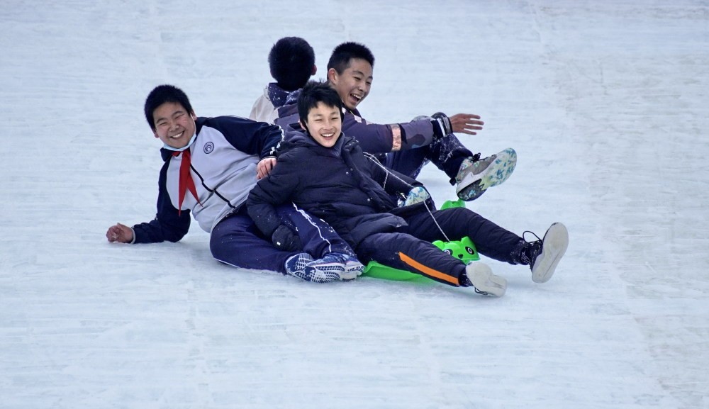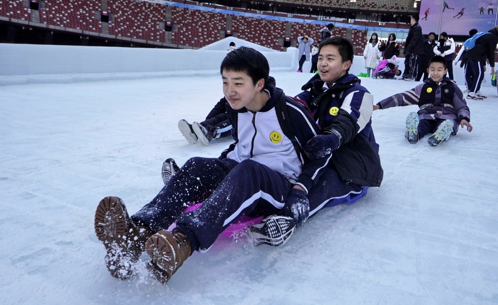12月29日,学生们在“鸟巢”欢乐冰雪季上玩耍。新华社记者 李欣 摄