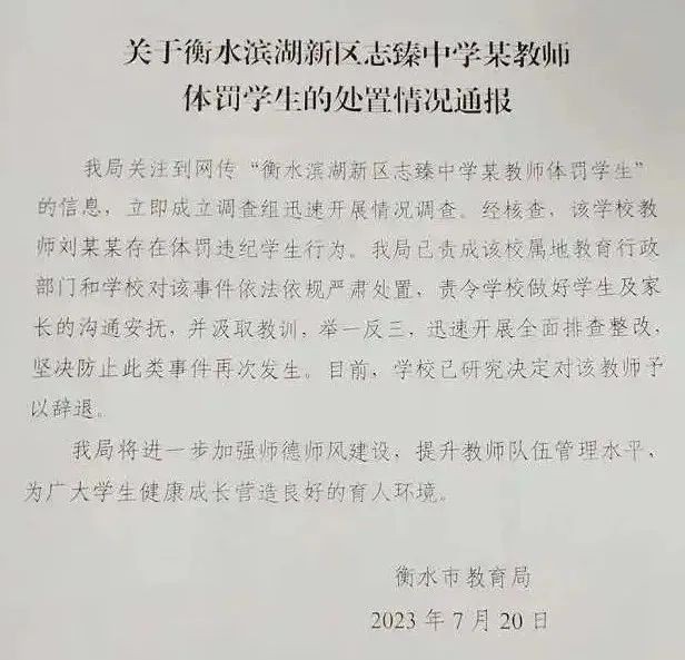 7月20日,河北省衡水市教育局发布通报称,该局关注到网传“衡水滨湖新区志臻中学某教师体罚学生”的信息,立即成立调查组迅速开展情况调查。经核查,该学校教师刘某某存在体罚违纪学生行为。教育局已责成该校属地教育行政部门和学校对该事件依法依规严肃处置,责令学校做好学生及家长的沟通安抚,并汲取教训,举一反三,迅速开展全面排查整改,坚决防止此类事件再次发生。目前,学校已研究决定对该教师予以辞退。