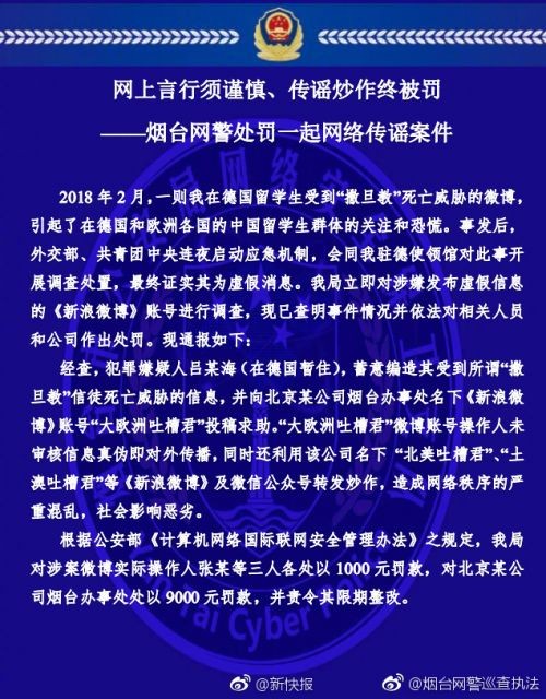 【警方公布“德国留学生遭遇撒旦教造谣事件”处理结果】2018年2月,德国留学生受“撒旦教”死亡威胁的微博引发了社会关注,后经过证实其为虚假消息。据@烟台网警巡查执法,犯罪嫌疑人吕某海(在德国暂住),蓄意编造其受到所谓“撒旦教”信徒死亡威胁的信息,并向北京某公司烟台办事处名下新浪微博账号“大欧洲吐槽君”投稿求助。“大欧洲吐槽君”微博账号操作人未审核信息真伪即对外传播,同时还利用该公司名下 “北美吐槽君”、“土澳吐槽君”等新浪微博及微信公众号转发炒作,造成网络秩序的严重混乱,社会影响恶劣。现已对涉案微博实际操作人张某等三人各处以1000元罚款,对北京某公司烟台办事处处以9000元罚款,并责令其限期整改。