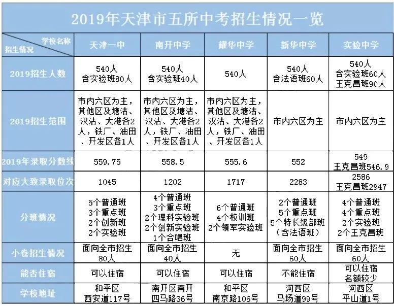 上图汇总了2019年天津高中“市五所”(一中、南开、耀华、新华、实验)的招生人数、招生范围、录取分数线、分数线对应的录取位次,分班情况、小卷招生情况、住宿情况和学校地址,尽可能全面的介绍了市五所的基本招生情况。