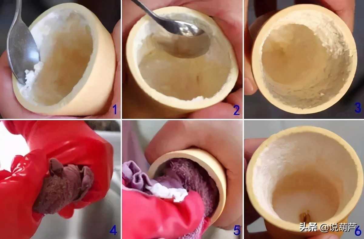 “贴里子”是最为简单有效的里子处理方式,总结起来就四个字——先刮后压。首先,视里子薄厚,用长柄小勺刮除二分之一到三分之二厚度的里子。(黑白虫葫芦底部里子可适当留厚一些,避免养虫过程中由于涮水造成阴底。)接下来,将热毛巾用力塞进葫芦内,用力旋转1-2分钟,然后用力按压着旋转取出毛巾。最后,将葫芦置于阴凉通风处晾干。