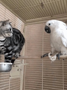 鹦鹉:你的猫粮可以给我吃点吗?就一点点…哎呀,不给就不给嘛,别打人呀!