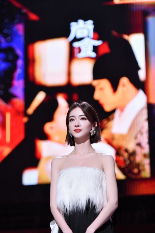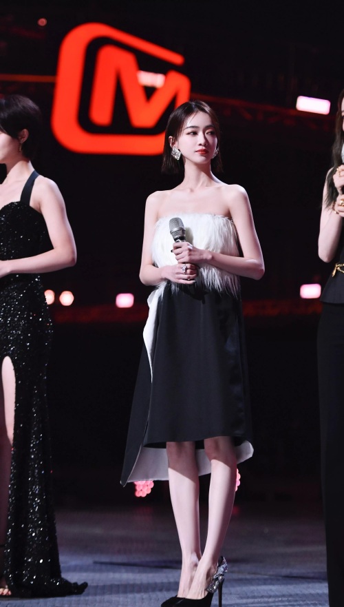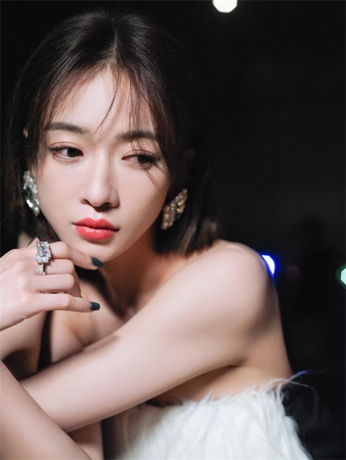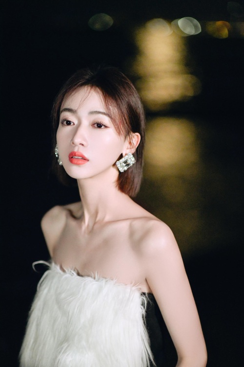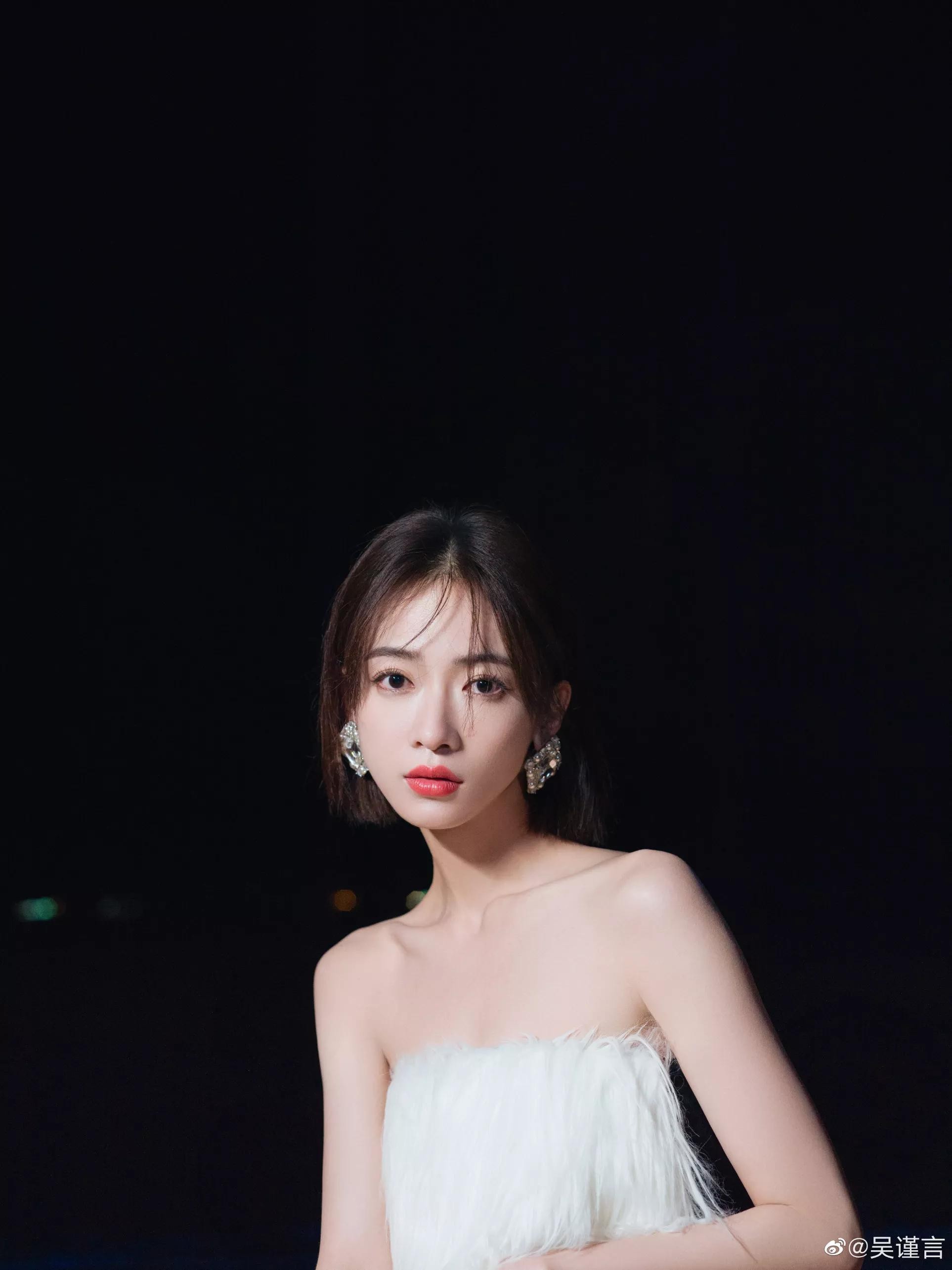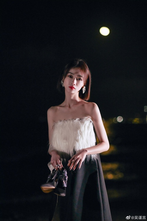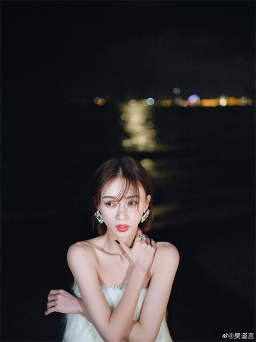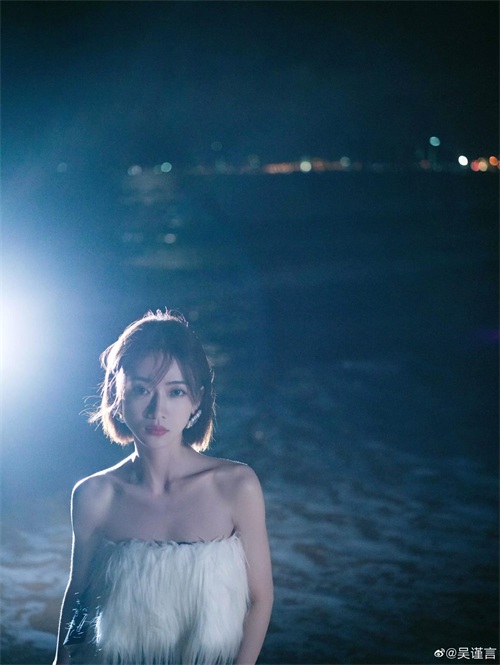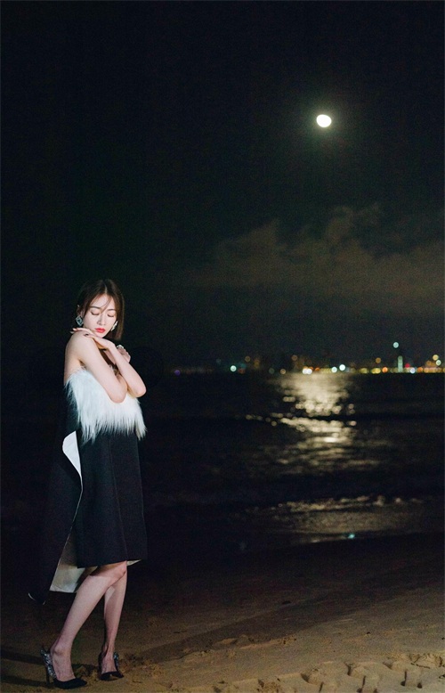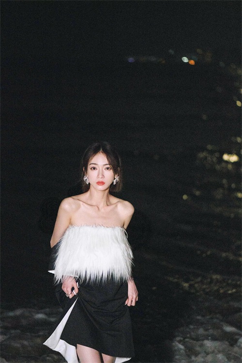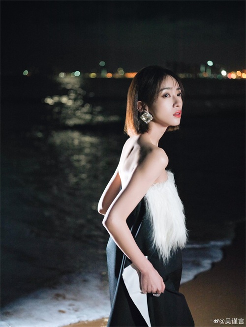 吴谨言海边夜拍,身穿黑白抹胸裙,肌肤白嫩,香艳迷人
