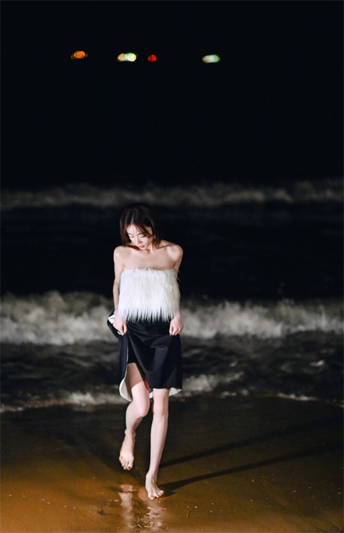 吴谨言海边夜拍,身穿黑白抹胸长裙,漫步海滩,肌肤白嫩,香艳迷人。