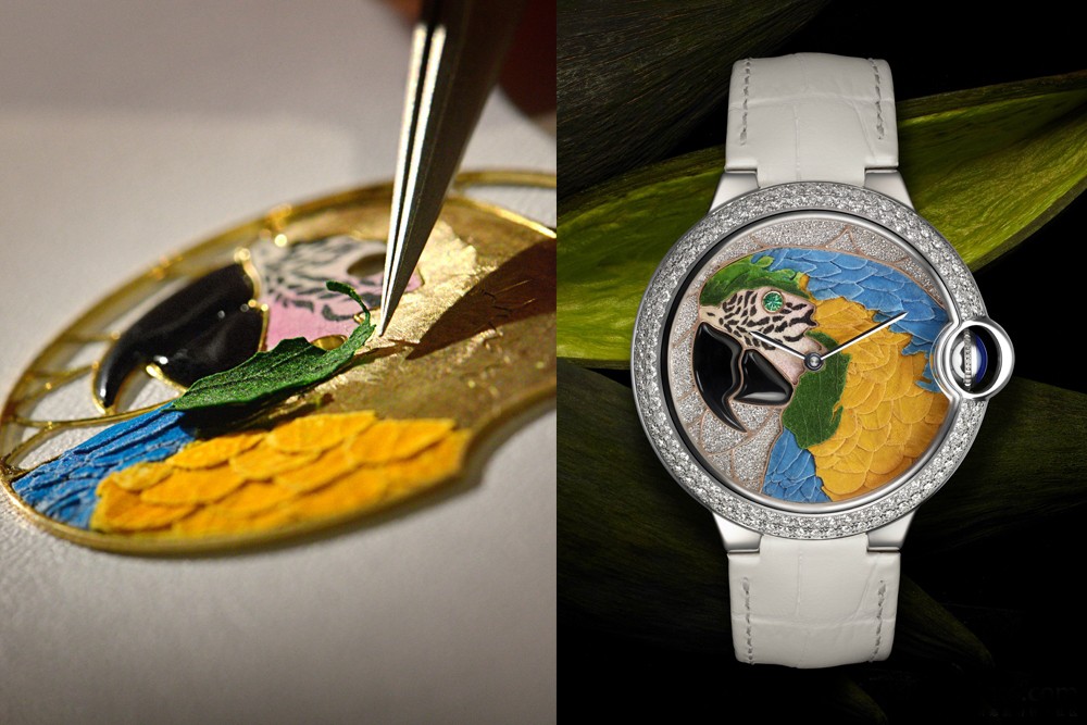 这款卡地亚全新新蓝气球,表盘鹦鹉的眼睛是一颗祖母绿,喙是黑玛瑙