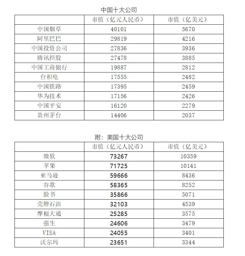 中国十大公司市值与美国十大公司市值相比还有差距,这也反映了中美实力的差距。中国最大公司中国烟草市值5670亿美元,只有美国最大公司微软公司市值10359亿美元的一半左右。