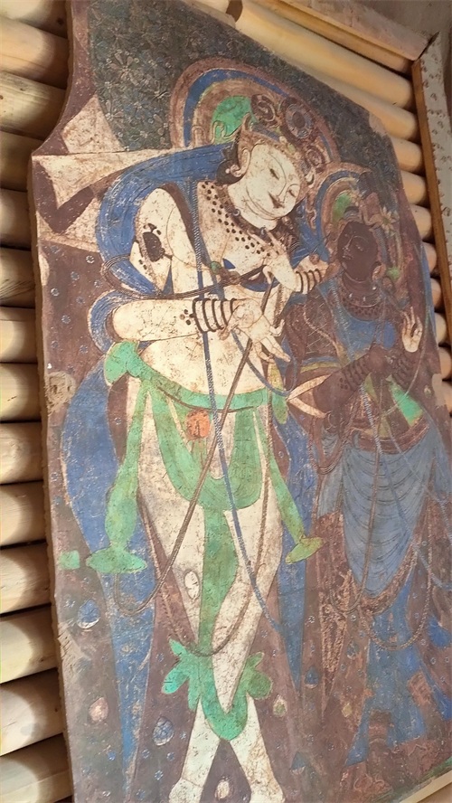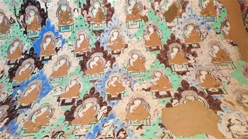 而对于克孜尔石窟,参观完以后内心多有遗憾和愤恨。愤恨的是那些文物偷盗者和破坏者。印象最深的便是我们很多完整的、精美的壁画真迹都存于德国、英国、日本...而我们自己只有复制品。以下这幅图中,所有佛的袈裟都漏出了土色,而这并不是他们本来的颜色。袈裟原本都是铂金,全部被盗掘者扣走了...