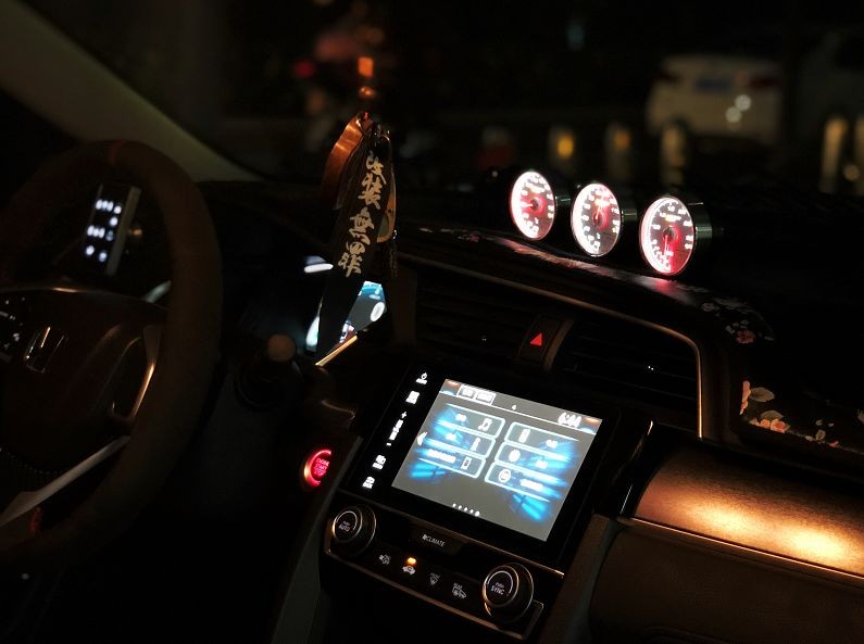 如果说改装外观是给别人看赚取后头率,那么改装内饰那就是给自己的。眼前这辆十代思域在内饰部分也有所大动作,方向盘用了意大利顶级alcantara翻毛方向盘套、Buddy club档把头、星空顶等等。