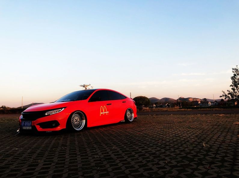 低趴玩家都知道,想要把低趴的气质完全展现出来,一套合适的轮毂决定这你的演绎是否成功,显然眼前的这辆十代思域很完美的展现出了HF的改装风。18寸的电镀轮与mason气动完美融合。