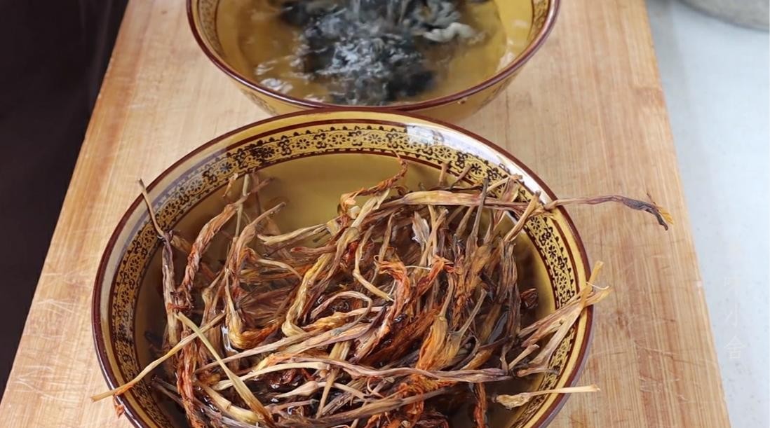 2.紧接着准备一小把的黄花菜,和50克的黑木耳。用温水将其泡发,油豆皮一块放在清水中给它泡软。油豆皮在超市里也能买得到。这就是胡辣汤所需要的配料啦。