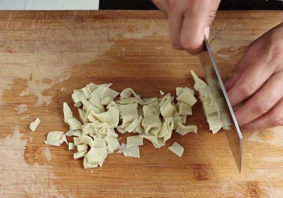 6.面筋泡发好后,我们再准备一个盆子倒扣过来。把面筋放在盆子底部摊成饼状。摊到越薄越好,炒锅烧热加入清水烧开。水烧开后把面筋放进去煮熟。然后捞出过凉。把它切条备用。
