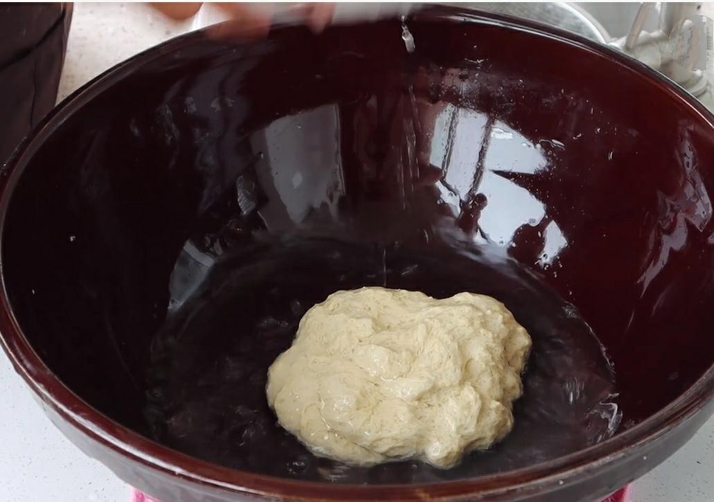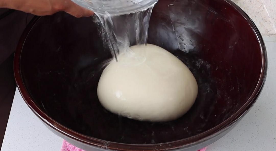 3.面团醒好之后,我们给它揉搓排气。往盆里加入一盆的凉水,然后用手给它抓起一遍。把面粉里面多余的淀粉洗出来,剩余的就是我们所说的面筋啦!洗至汤汁浓稠的时候,然后又滤网把这些面筋过滤出来。