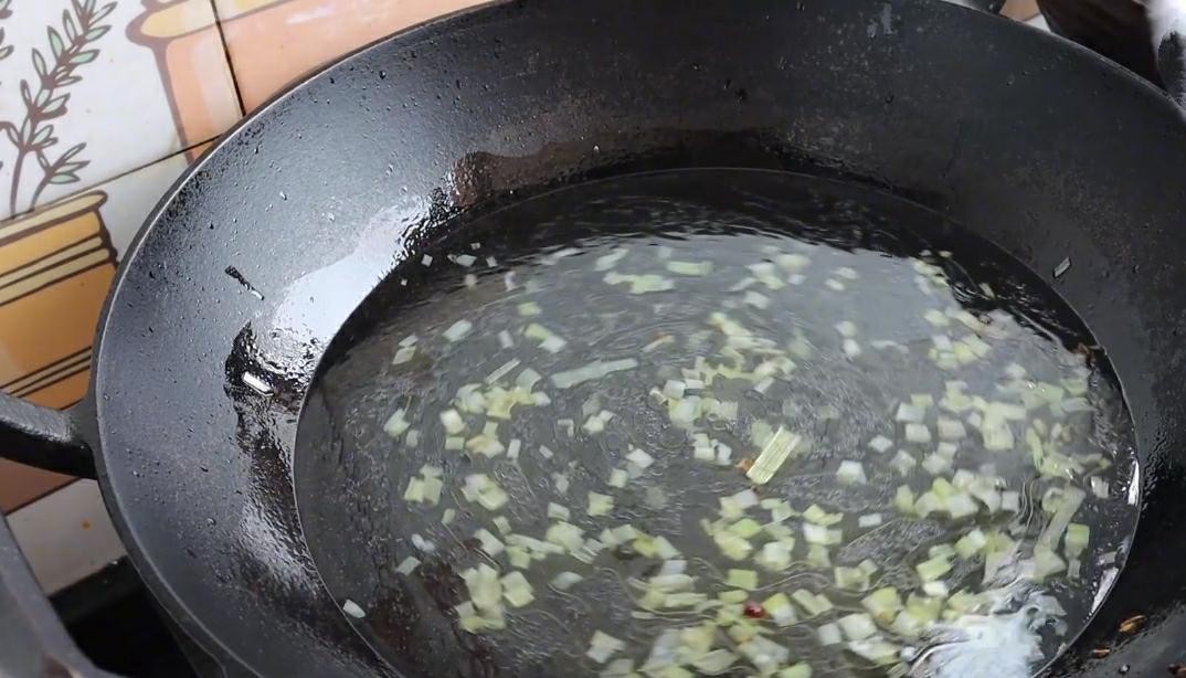 7.炒锅烧热在里面加入适量的食用油,油热后把准备好的花椒香料八角放在里面炒香,炒香后立即捞出。然后往里面加入一小把的葱花炒出香味。然后再倒入适量的清水。