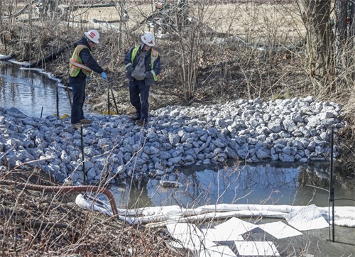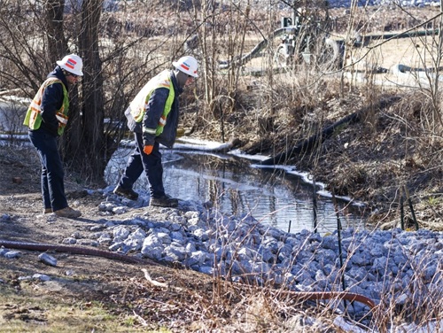 当地时间2023年2月18日,美国俄亥俄州东巴勒斯坦,俄亥俄州列车脱轨致有毒气体扩散事件持续发酵,工作人员过滤小溪中的水源。
