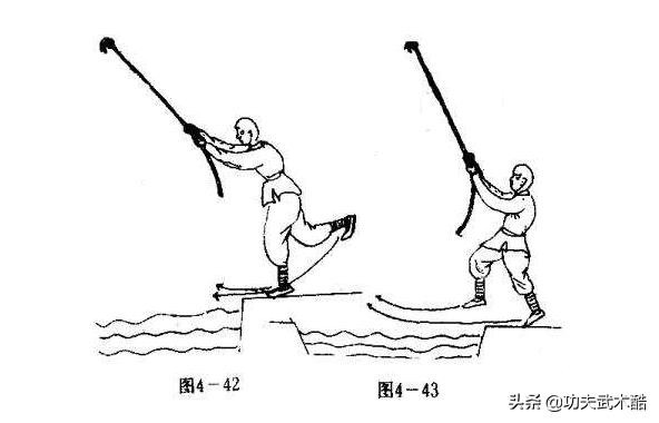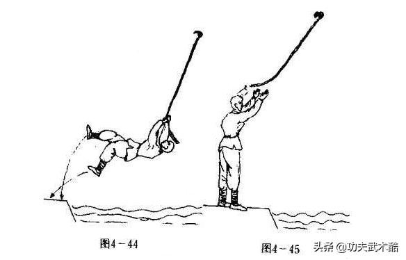 将绳一端系一铁钩,然后把钩子抛于沟上方的树枝上挂牢.再将绳向后拉成斜绳,用一臂伸直握在头部上方的吊绳上,然后向前跑一步,用脚蹬地跳起,同时用另一手握在上手的上面,成悬垂摆荡动作,向前摆时稍屈腿,摆过壕沟后,右腿向左,左腿向右,做剪绞动作,带动向左转体180度,在摆至对岸极点时放手,双脚落地,屈膝缓冲(图4-42,43,44,45)。